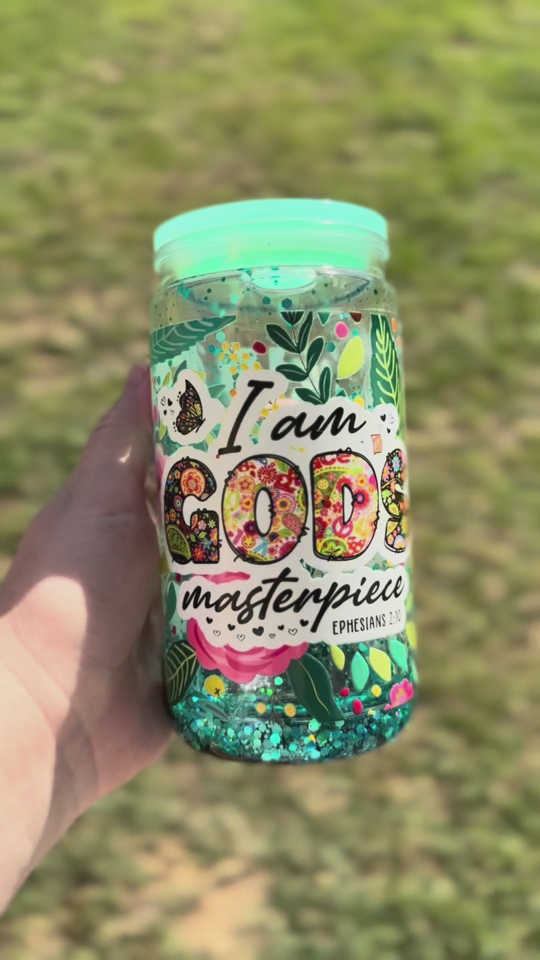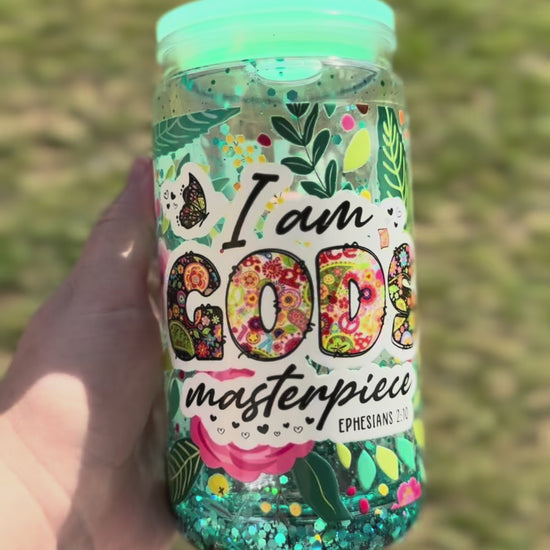 16oz snowglobe cup with "I am God's masterpiece" decal. Teal lava flow and teal glitter.