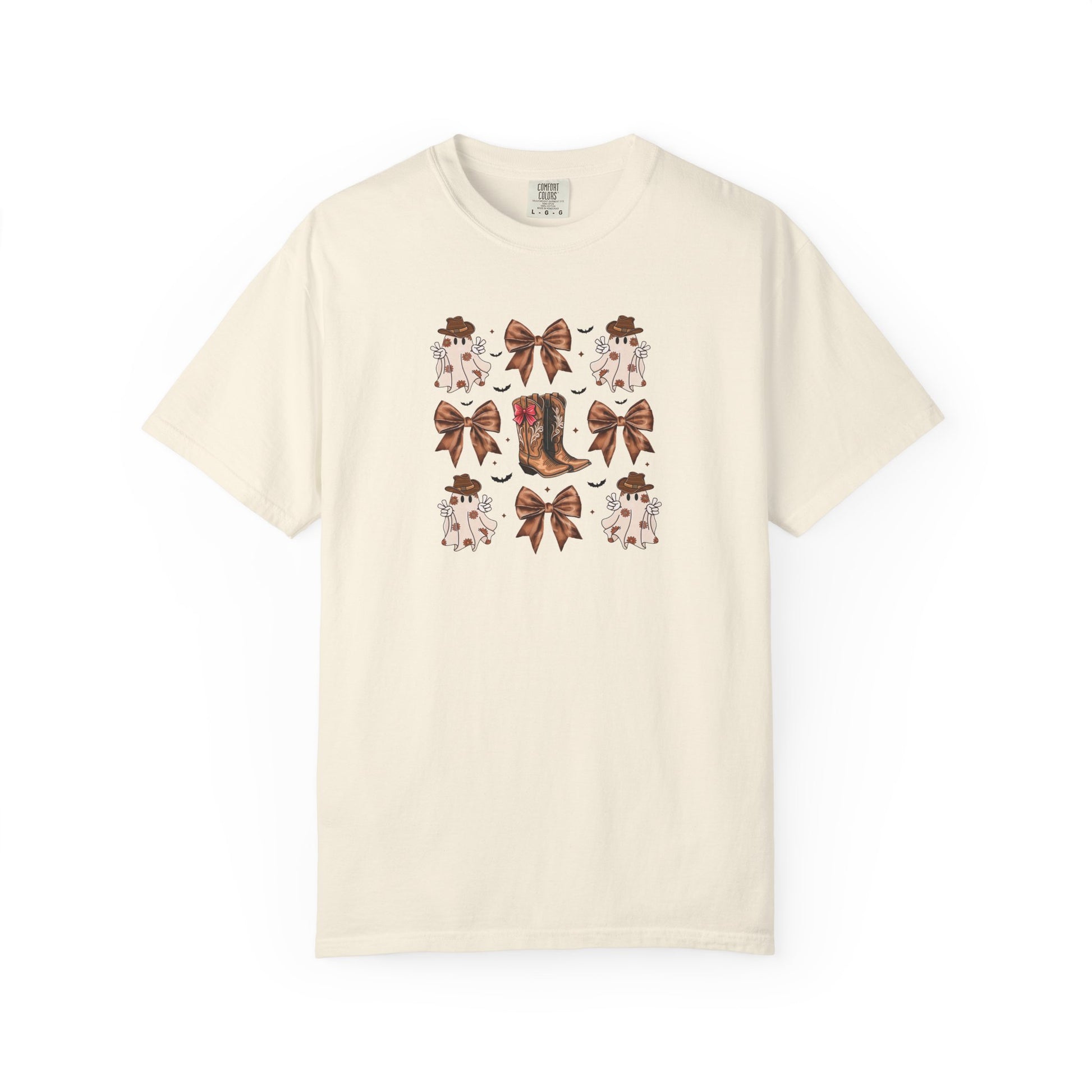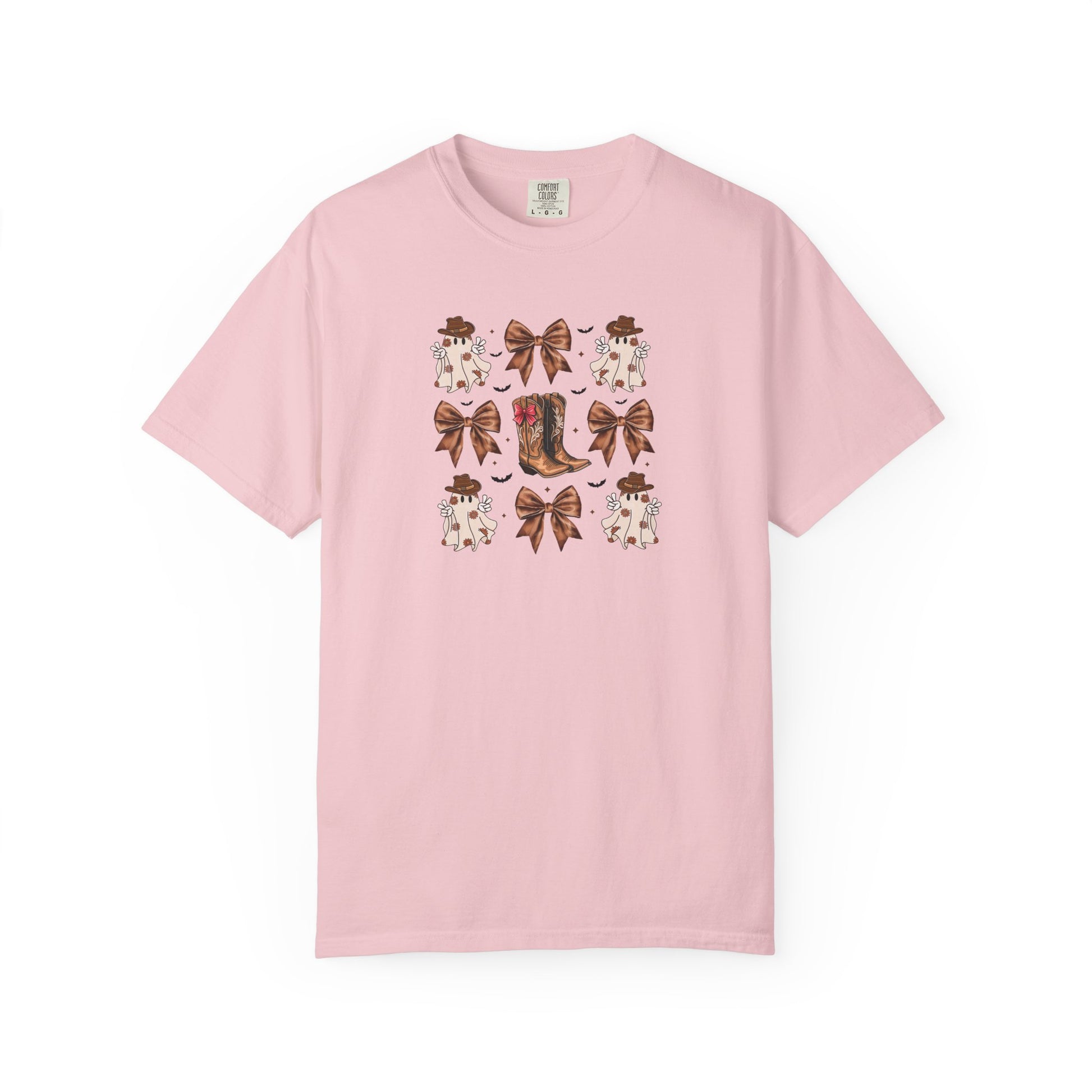 Saddle up for spooky season with our Cowgirl Ghosts & Boots graphic tee! Featuring cowboy-boot details, western bows, and adorable little ghosts in hats, this Comfort Colors shirt is the perfect mix of country charm and Halloween fun.