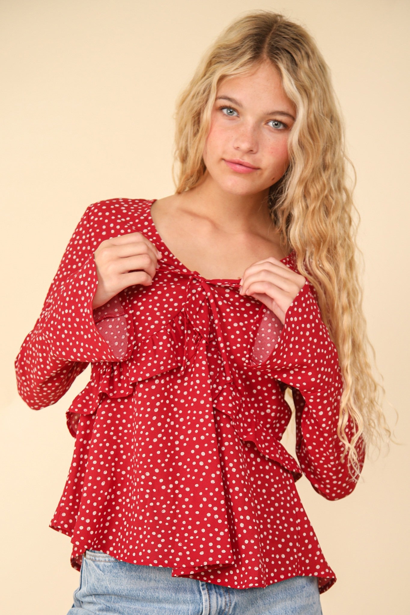 The Dotted Daydream Top is a charming addition to your wardrobe, featuring a vibrant red and white polka dot pattern that brings a playful touch to any outfit.