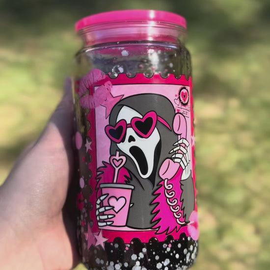 This is a ready-to-ship 16oz snowglobe tumbler. Black honey drip with white glitter. Comes with the hot pink lid, as shown, and matching straw.