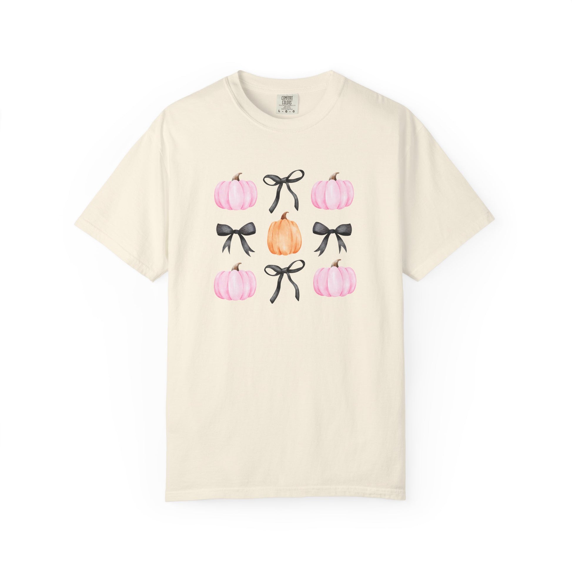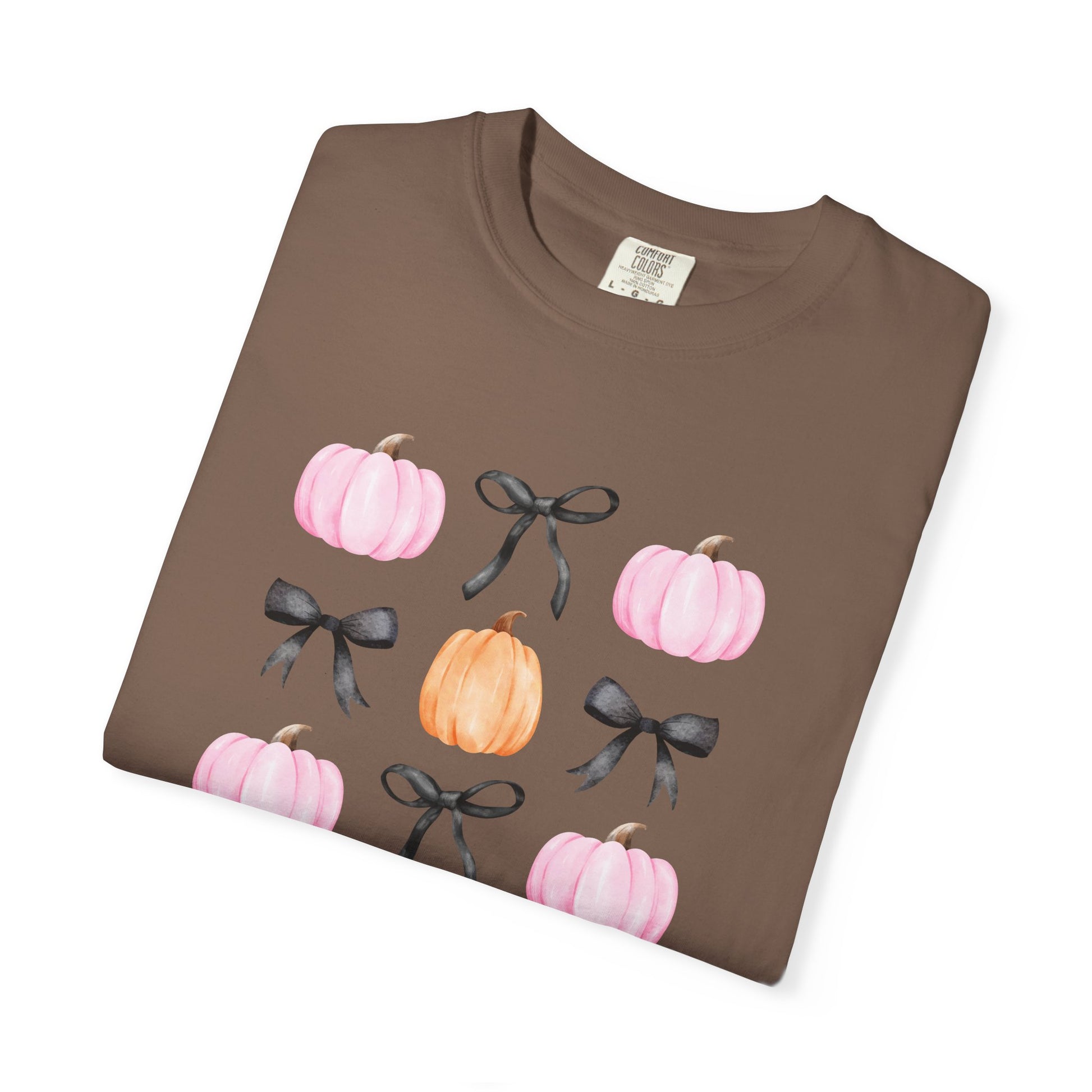 Add a touch of cozy charm to your fall wardrobe with our Pumpkins & Bows Comfort Colors Tee! This soft, garment-dyed shirt features a playful design of pastel pumpkins and chic black bows—perfect for pumpkin patches, fall festivals, or lounging in style. A must-have for anyone who loves cute and trendy fall fashion.