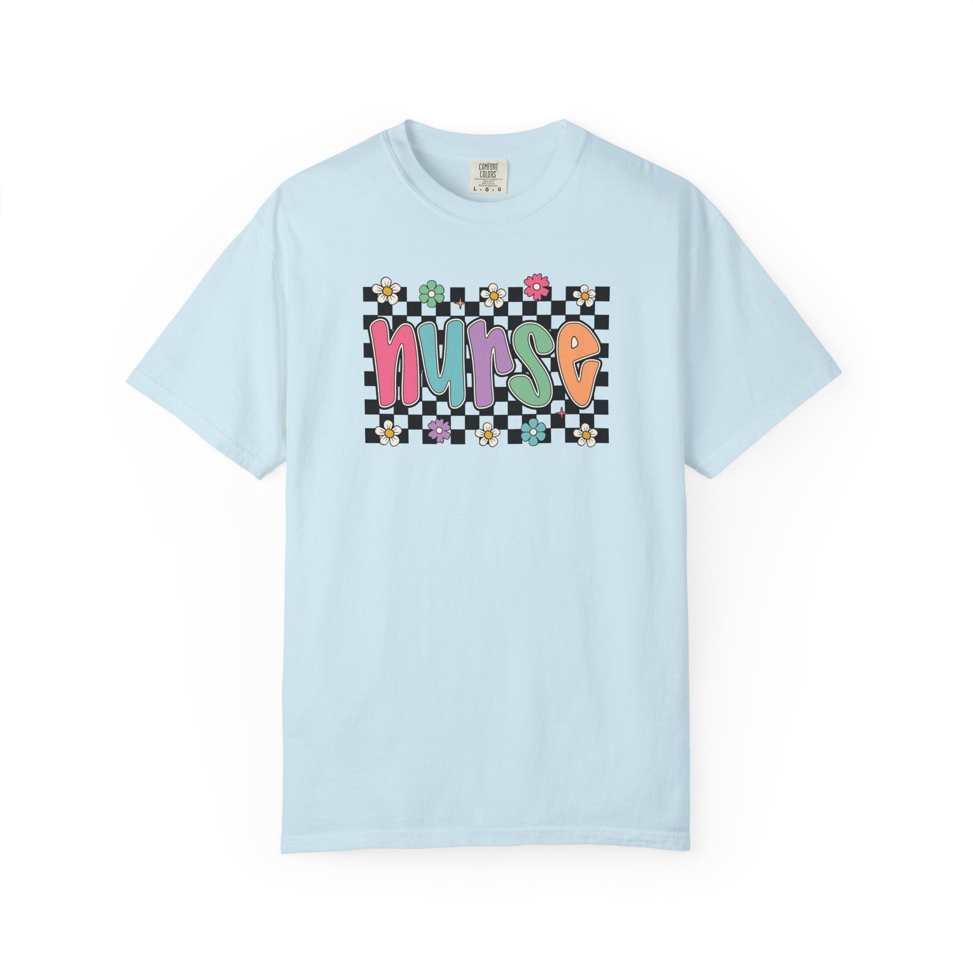 Comfort Colors tee with colorful “Nurse” text, floral accents, and checkered background