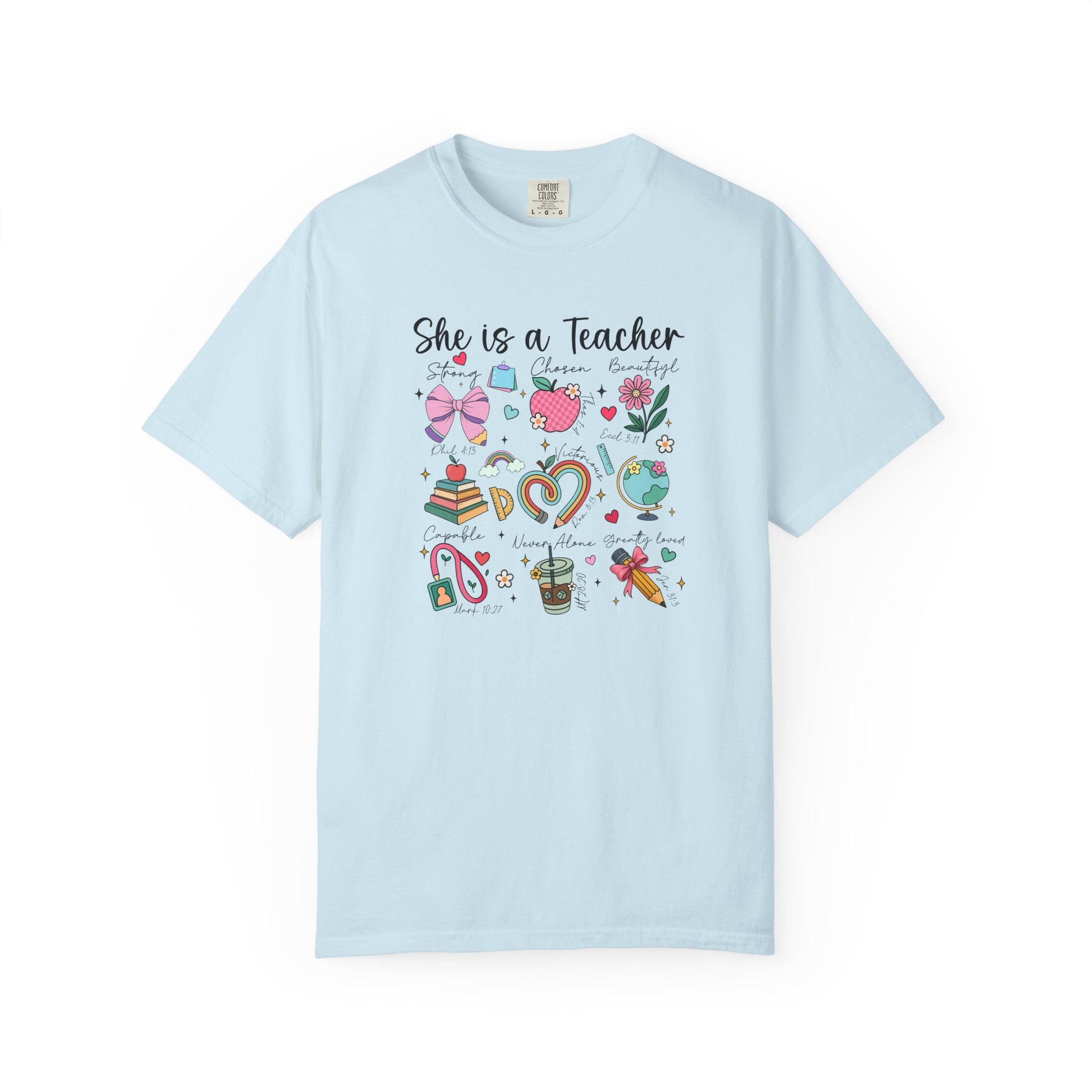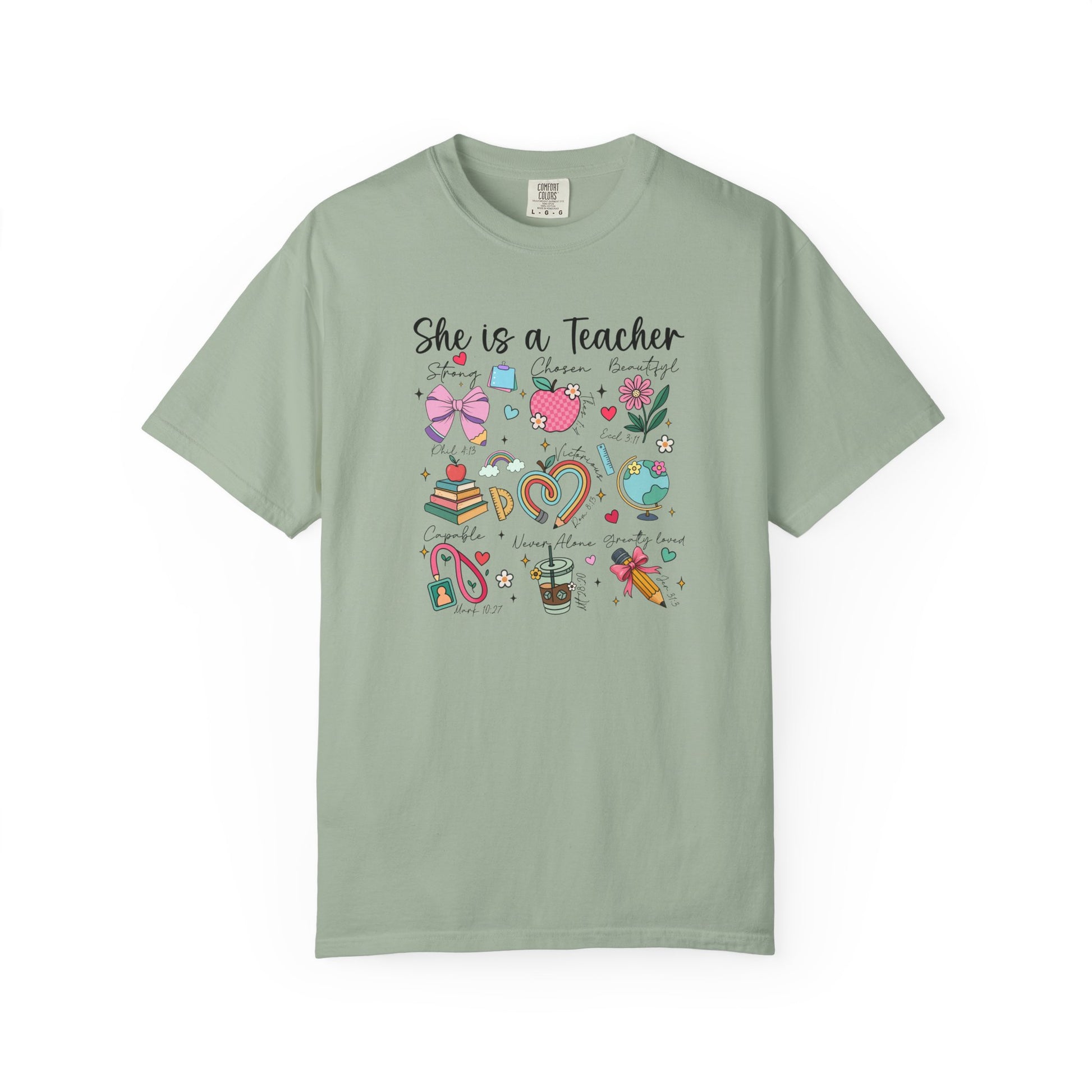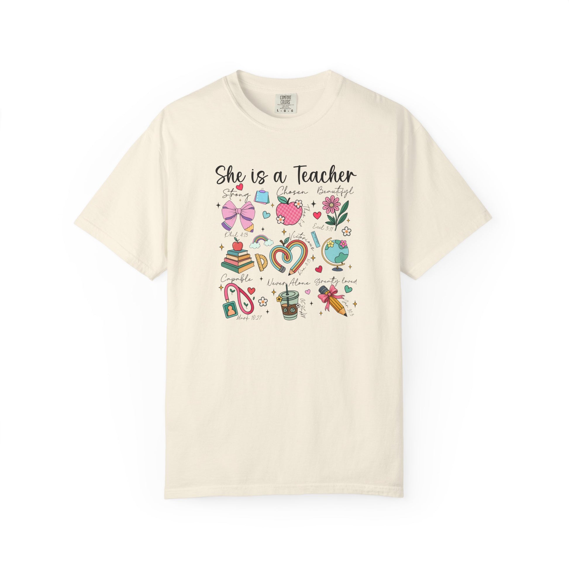 Comfort Colors tee with colorful “She is a Teacher” graphic featuring books, apple, globe, flowers, and Bible verses.