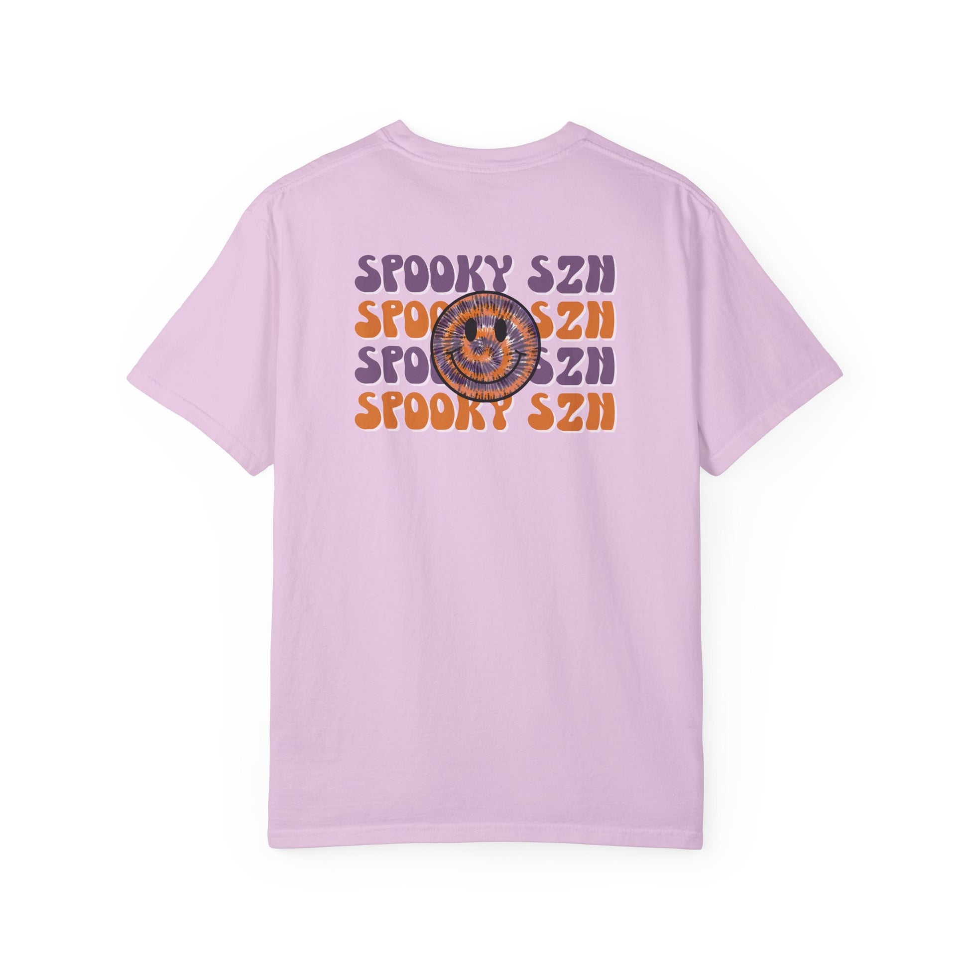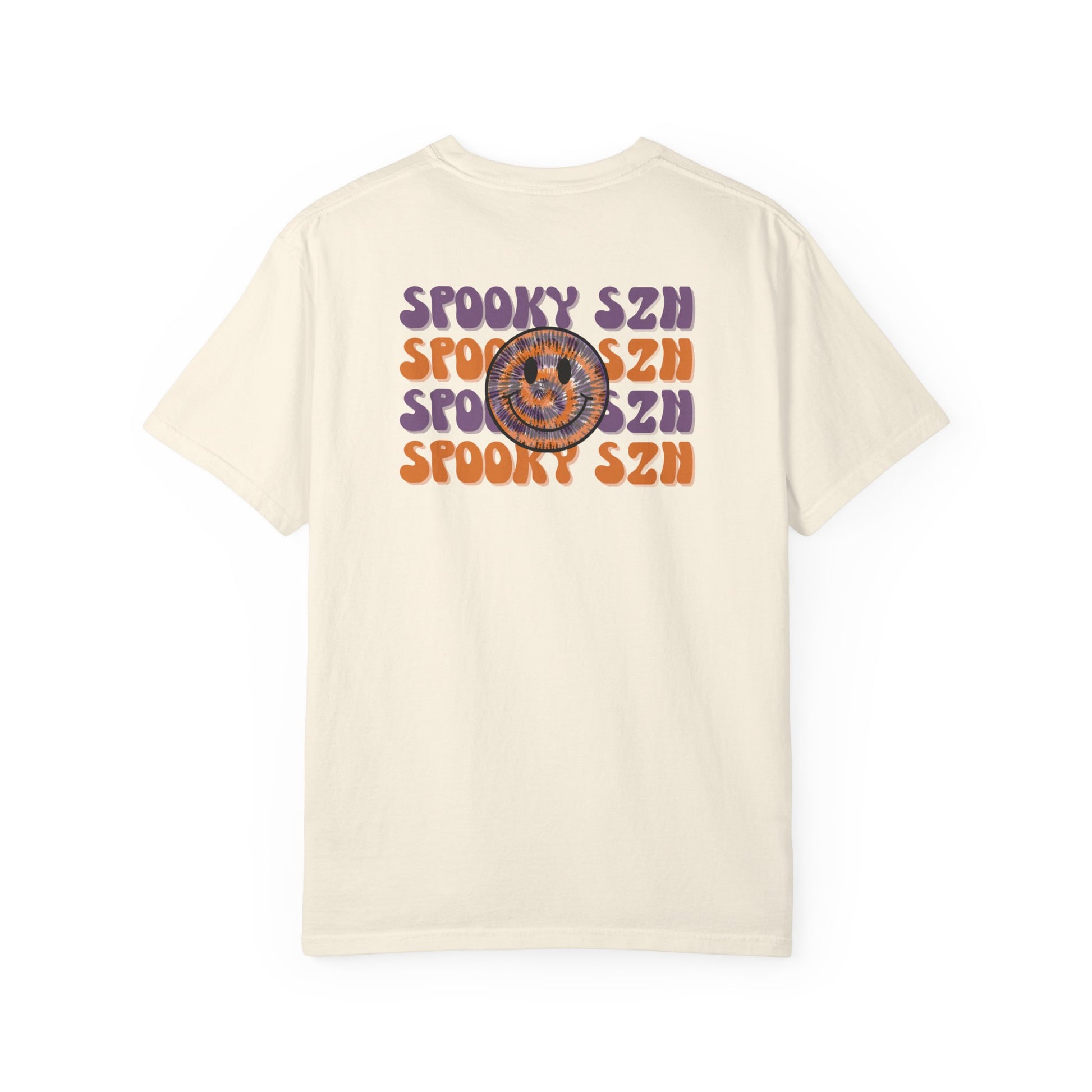 Comfort Colors tee with retro “Spooky SZN” back print and jack-o’-lantern graphic