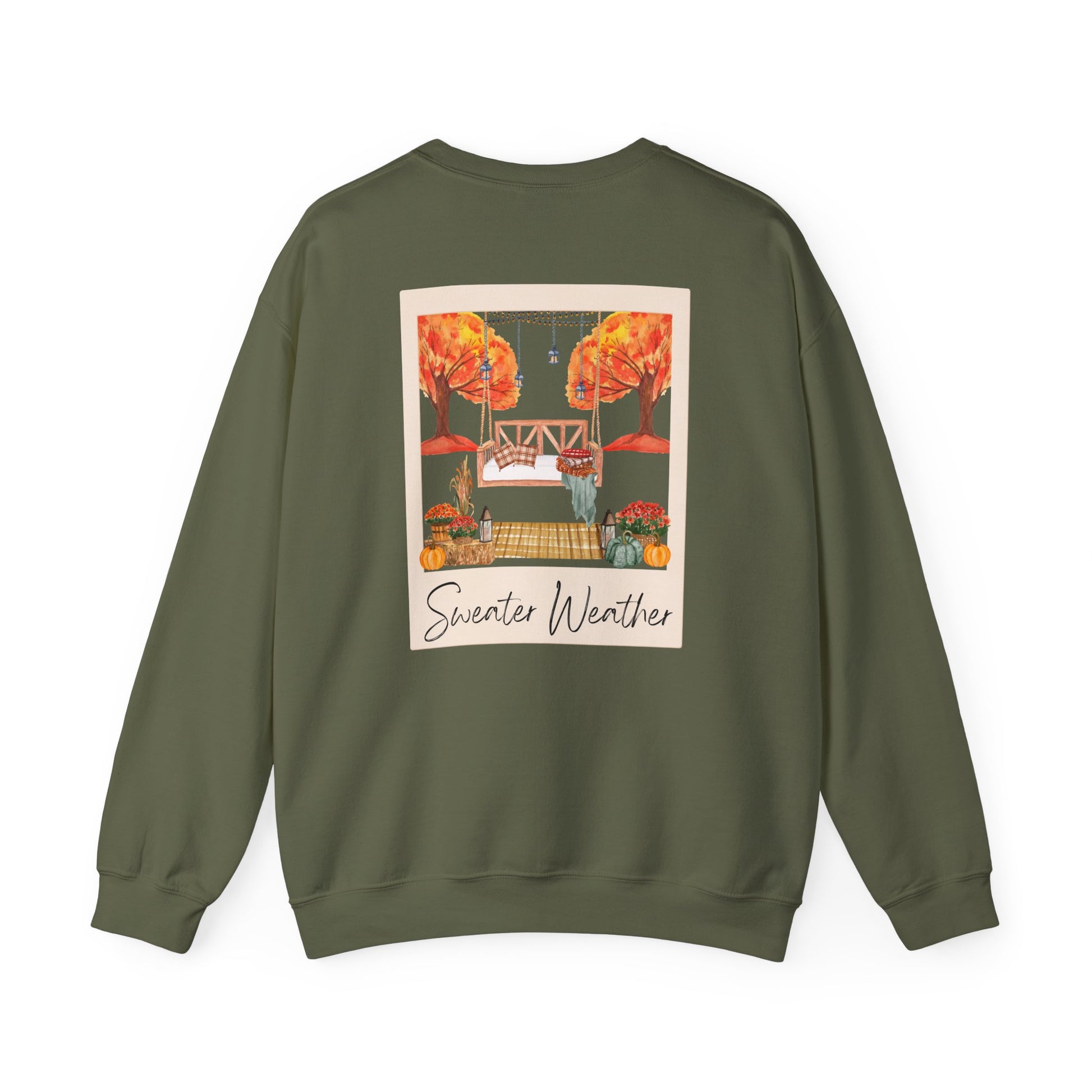 Sweatshirt with cozy fall porch graphic and “Sweater Weather” text